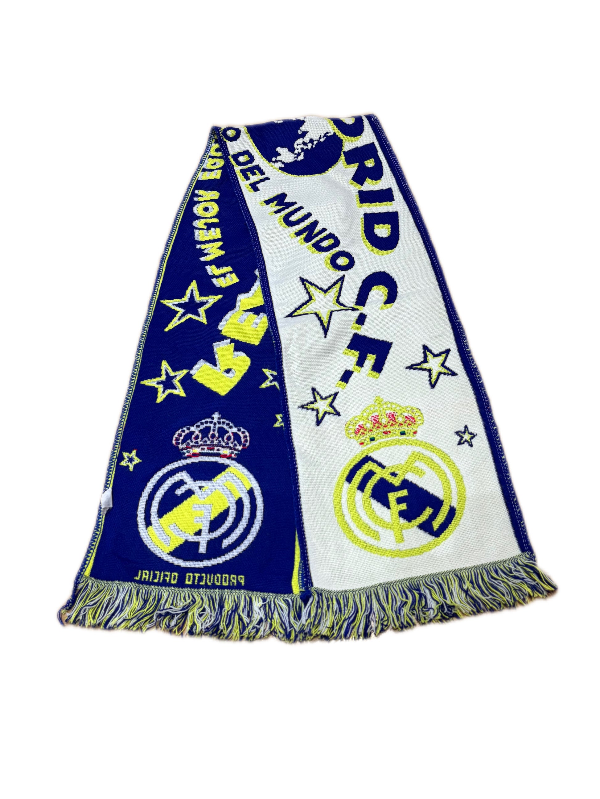 Esta es una bufanda oficial del Real Madrid C.F. con un diseño de estilo retro o "vintage". Se caracteriza por el lema "El mejor equipo del mundo" impreso en el centro, acompañado de una ilustración del mapa mundial en azul.
