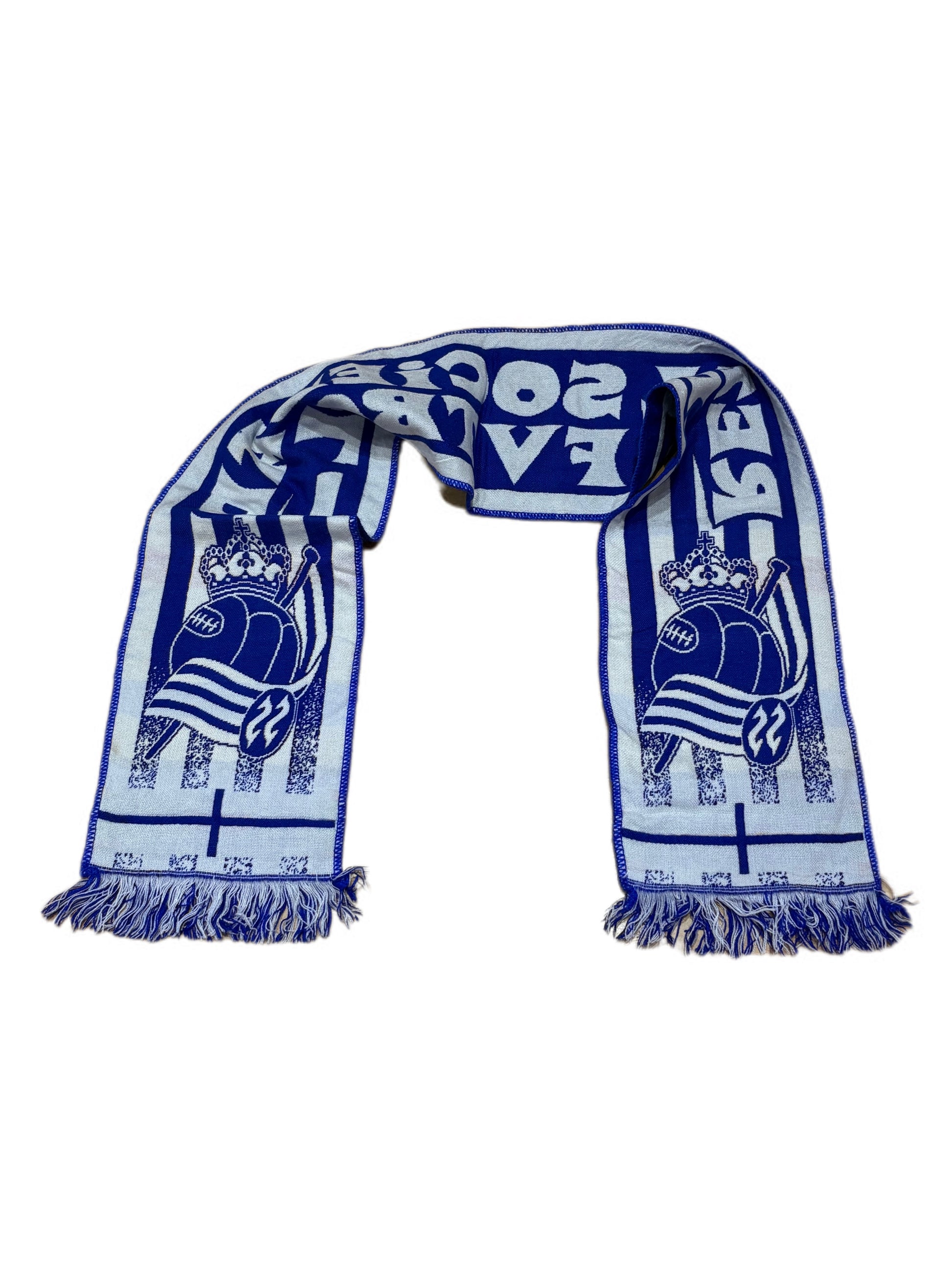 Presenta los colores tradicionales del club, azul y blanco. Incluye el nombre del equipo "REAL SOCIEDAD DE FUTBOL" y el escudo oficial del club en ambos extremos.